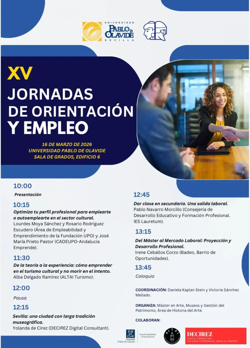 La Universidad Pablo de Olavide celebra las XV Jornadas de Orientación y Empleo del Máster en Arte, Museos y Gestión del Patrimonio Histórico, un encuentro entre estudiantes y profesionales del sector cultural.